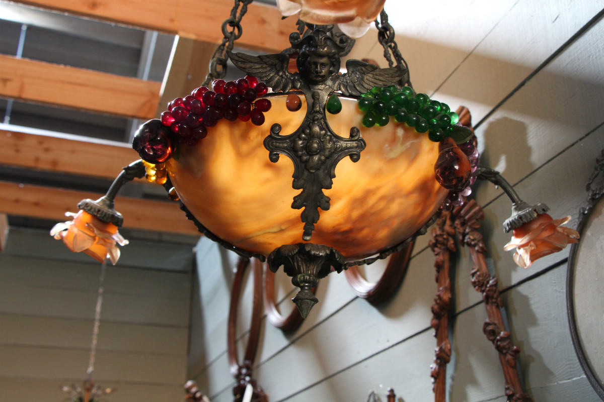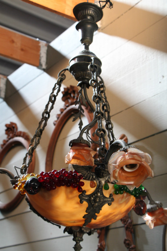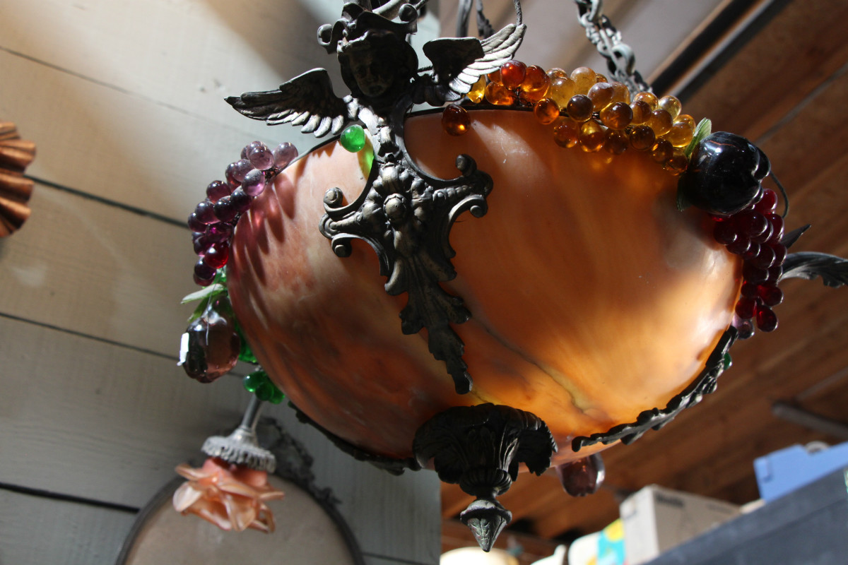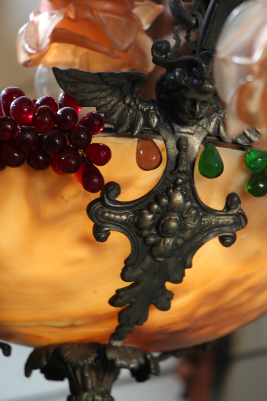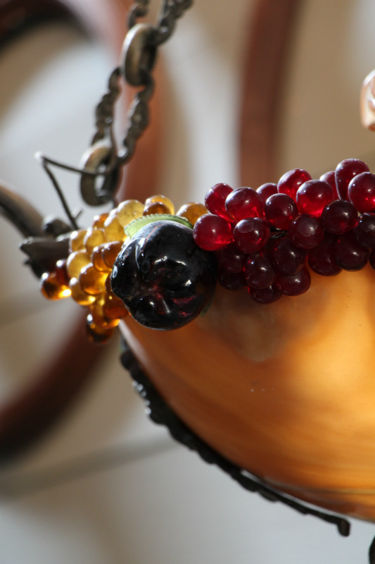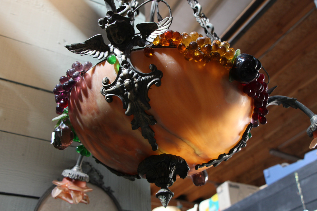 Lustre en albatre et decorations de fruits en verre coloré