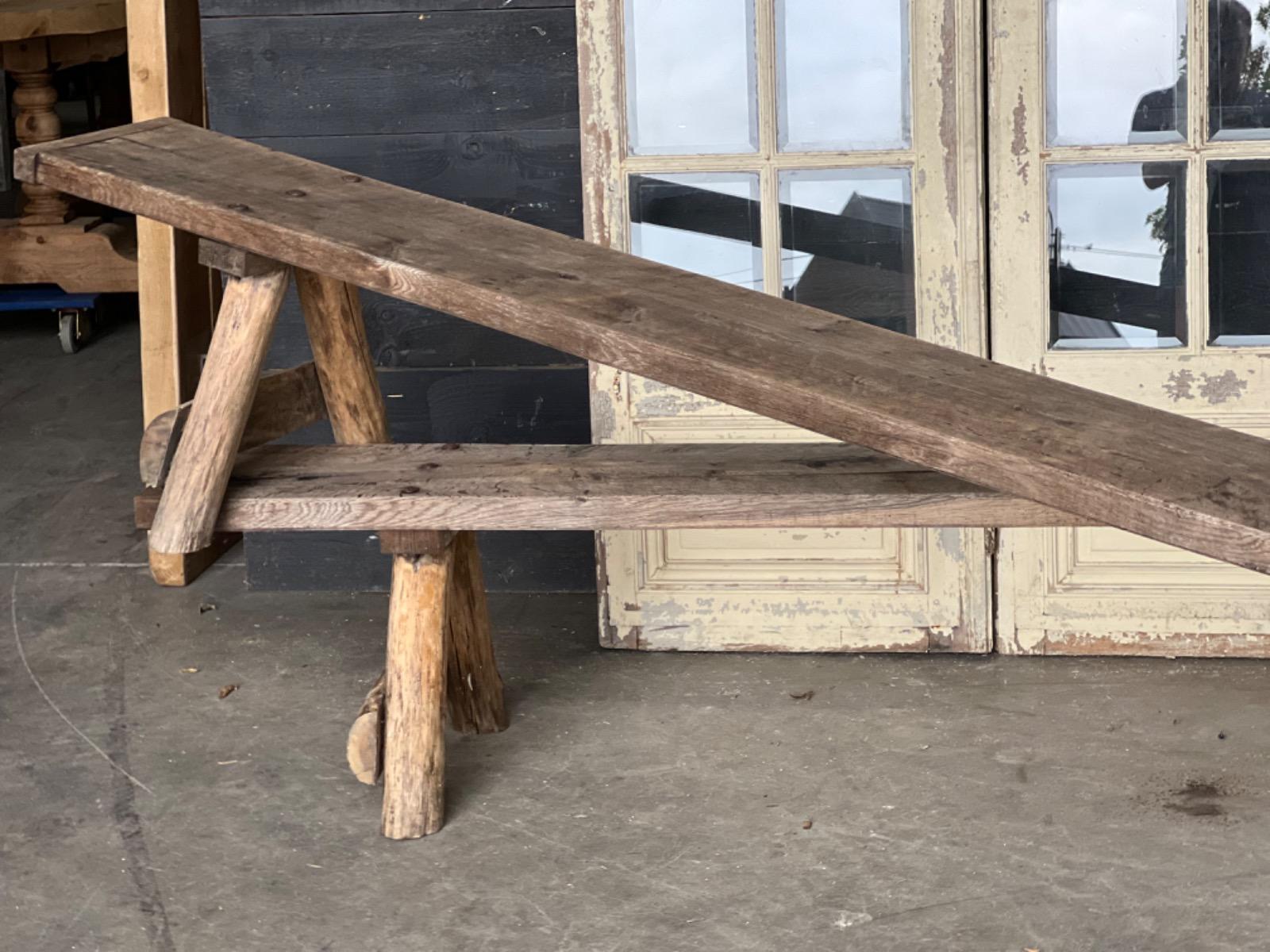 unusual pair of french chalet rustic benches in oak and pine legs